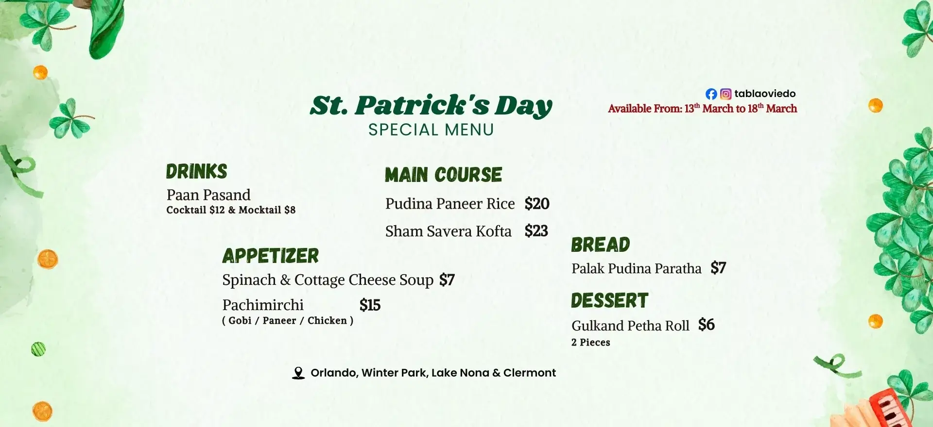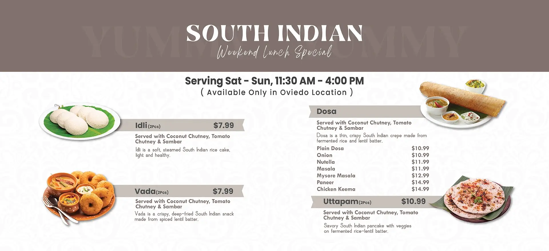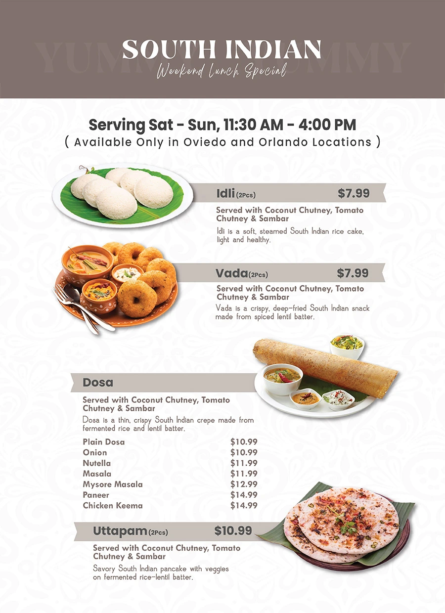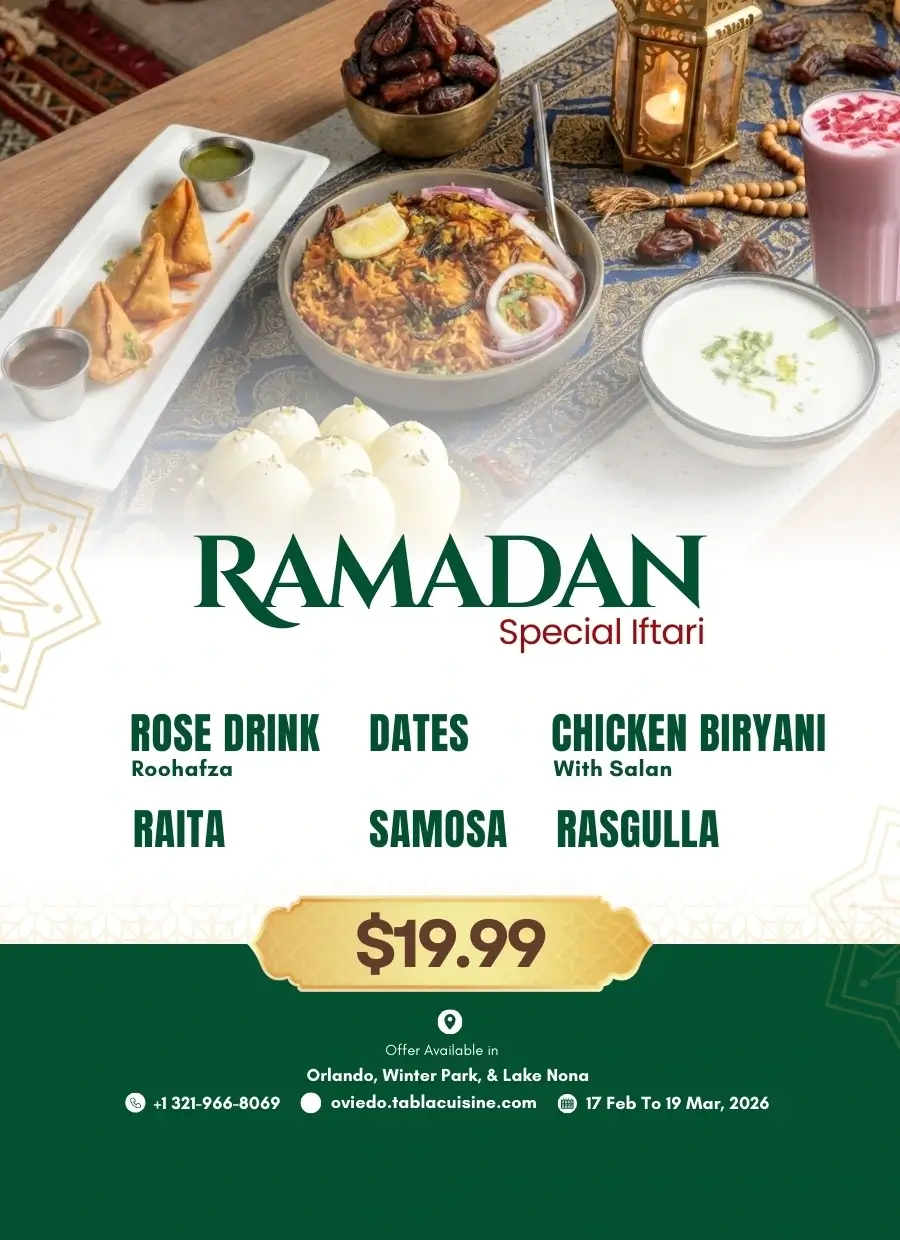 At Tabla Indian Restaurant in Oviedo, we are your go-to destination for authentic Indian and multi-cuisine dishes, carefully prepared to preserve the true flavors of each cuisine. Whether you’re stopping by for breakfast & lunch in Oviedo or planning a relaxed dinner, Tabla offers something for every craving. From flavorful Thai food and popular Indo-Chinese dishes in Oviedo to the best Indian food in Oviedo, our diverse menu has you covered. Located just 2 miles from the University of Central Florida, our kitchen serves homestyle curries that feel like a home away from home for students and locals alike.